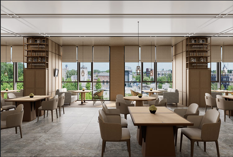 * Issiq neytral ranglar: qizg'ish-jigarrang ohangda, namuna bilan qizarib yuboradigan vangiz tijorat muhitini yaratish uchun mos keladigan karamelli ohanglar.