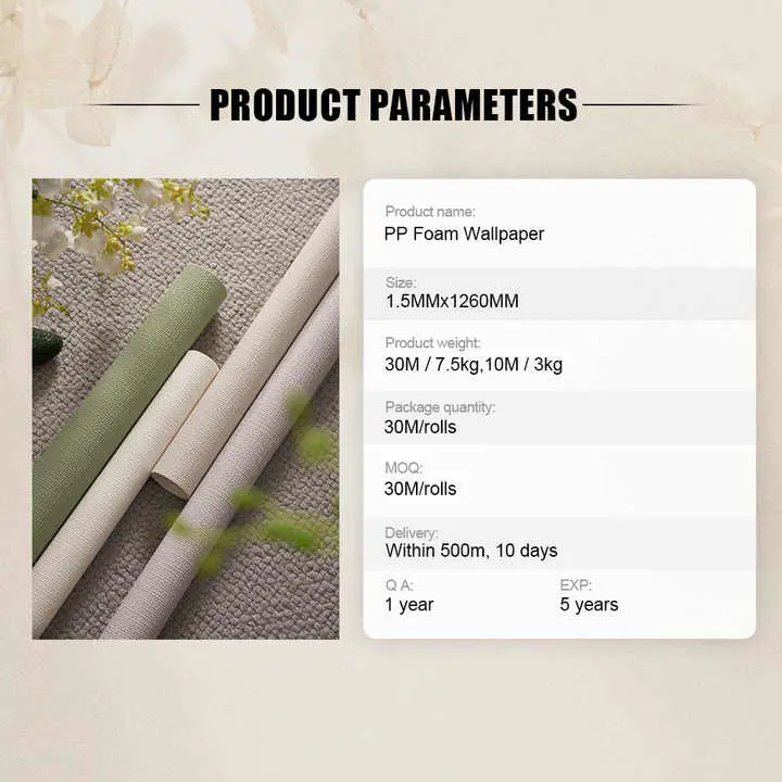 Bardoshli va suvga chidamli materiallar: Bizning PP ko'pikli devor qog'ozi yuqori sifatli polipropilen materialdan tayyorlanadi, uni turli muhitda, shu jumladan uy sharoitida, shu jumladan uy sharoitida, shu jumladan uy sharoitida ishlatish va boshqaruv bo'shatlari mavjudligini ta'minlaydi.